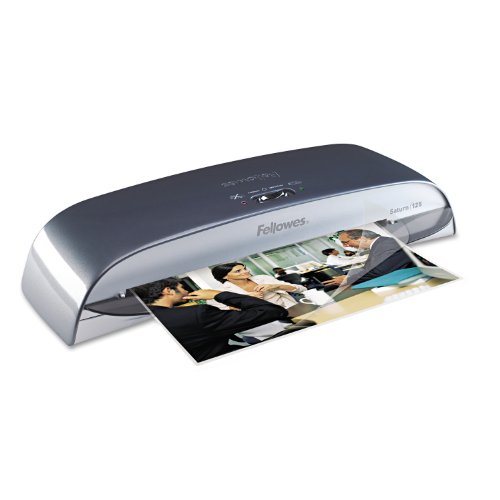 Designed for small office applications, the Fellowes Saturn 125 Laminator accommodates 12-1/2 Inches wide documents and features advanced temperature control for consistent results. Unique HeatGuard Technology keeps heat inside so laminator is cool to touch. Hot lamination for 3-mil or 5-mil pouches; ready in 5 minutes, laminates a document in one minute. Release lever disengages pouch for re-centering or removal. Sturdy carrying handle plus stand-up feet with cord storage. Includes laminating starter kit. The Fellowes Saturn SL 125 12.5" Home and Office Laminator, the first laminator designed for home or home office and small office. User-friendly design offers numerous laminating possibilities with minimal adjustment. Dual temperature settings for laminating 3 and 5 mil hot pouches. Designed for letter or tabloid-size applications up to 9" and 12" wide. Heats up in just 6 minutes and completes a letter-size lamination in less than 1 minute. Safe and comfortable to touch "HeatGuard Technology". Advanced temperature control for consistent lamination quality. Anti-jamming release lever. Acoustic and visual indicators clearly signal when the laminator is ready to use. Front flap serves as document guide and dust cover. Unique horizontal storage capability. Stand-up feet with cable management system. Carry handle and compact size easy portability.